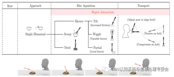 喂食是一項復雜的任務,創建用于進食的操作行為分類有助于系統地將其分類為子任務。通過細分,研究者們可以更好地了解人們在此任務的不同階段使用的不同策略。通過將喂食任務分為四個主要階段:1)休息,2)方法,3)獲取咬痕,4)運輸,研究者們制定了與喂食任務相關的操作策略的部分分類法(圖3)。