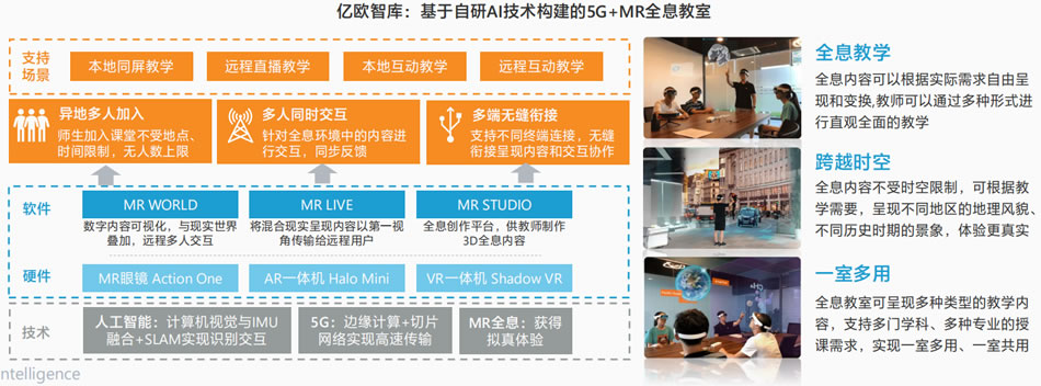專(zhuān)注于混合現(xiàn)實(shí)(MR)L域的影創(chuàng)科技,以融合人工智能技術(shù)的MR混合現(xiàn)實(shí)眼鏡為核心,構(gòu)建了“5G+MR”全息教室的解決方案。該系統(tǒng)在教