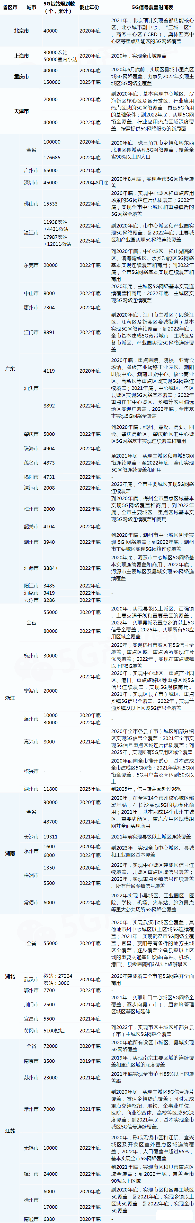 30省及部分地市5G建設規劃表如下: