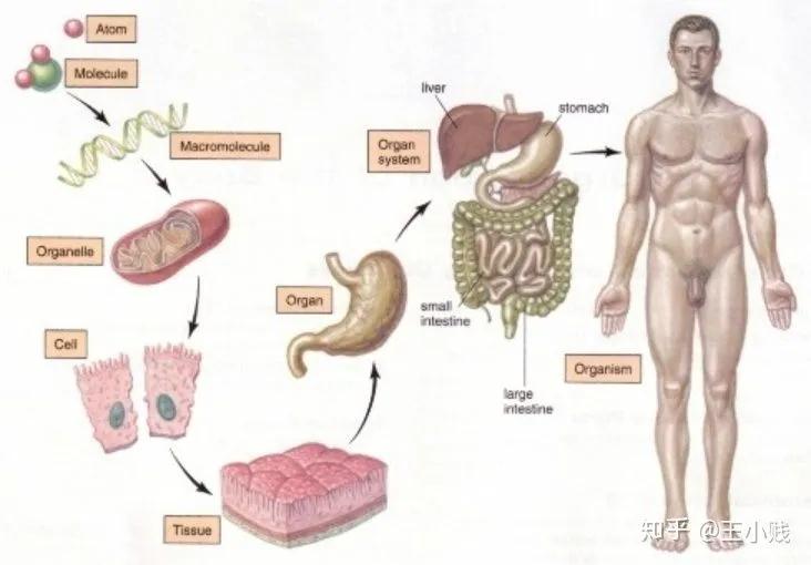 通過上一節的介紹我們也了解到,深度學習的黑箱性主要來源于其G度非線性性質,每個神經元都是由上一層的線性組合再加上一個非線性函數的得到,我們無法像理解線性回歸的參數那樣通過非常solid的統計學基礎假設來理解神經網絡中的參數含義及其重要程度、波動范圍。但實際上我們是知道這些參數的具體值以及整個訓練過程的,所以神經網絡模型本身其實并不是一個黑箱,其黑箱性在于我們沒辦法用人類可以理解的方式理解模型的具體含義和行為,而神經網絡的一個非常好的性質在于神經元的分層組合形式,這讓我們可以用物質組成的視角來理解神經網絡的運作方式。比如如下圖所示,人體的組成過程是從分子-細胞-組織-器官-系統-人體: