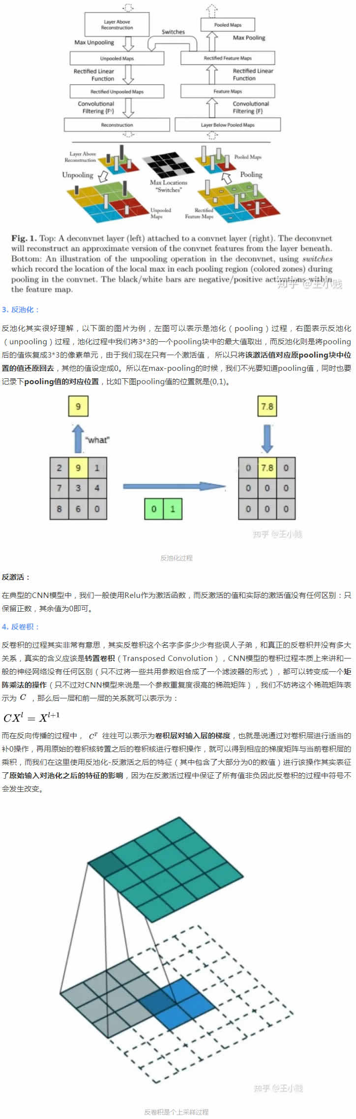 要理解神經網絡中每層都學到了哪些概念一個非常直觀的方法就是通過對隱層運用一些可視化方法來將其轉化成人類可以理解的有實際含義的圖像,這方面一個非常具有代表性的一個工作就是14年ECCV的一篇經典之作:《Visualizing and Understanding Convolutional Networks》,這篇文章主要利用了反卷積的相關思想實現了特征可視化來幫助我們理解CNN的每一層究竟學到了什么東西。我們都知道典型的CNN模型的一個完整卷積過程是由卷積-激活-池化(pooling)三個步驟組成的。而如果想把一個CNN的中間層轉化成原始輸入空間呢?我們就需要經過反池化-反激活-反卷積這樣的一個逆過程。整個模型的結構如下圖所示: