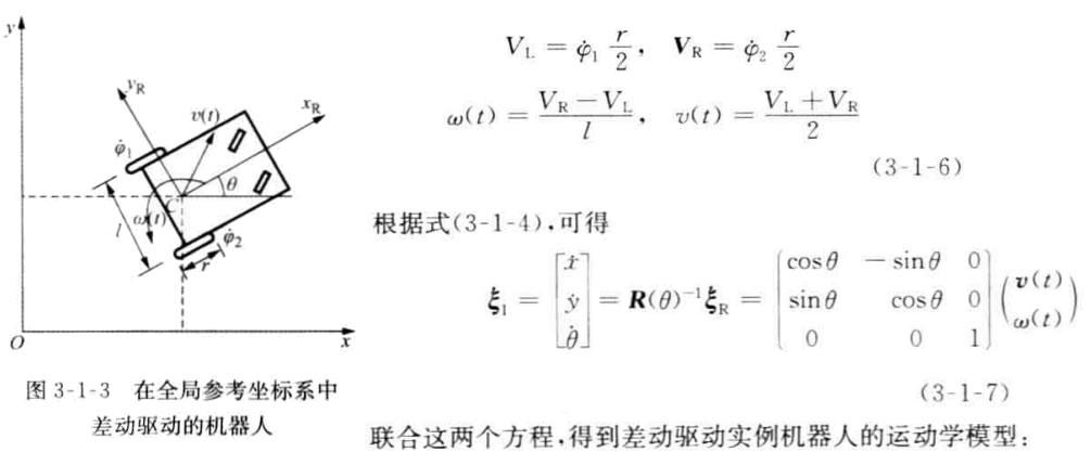 假定機器人在運動中質心的線速度為v(t), 角速度為w(t), 左右兩輪的轉速分別為ψ和 中₂,機器人左右兩輪的運動速度分別為 VI, VR。給定r,1,θ, 以及根據圖3-1-3所示的幾 何關系,考慮到移動機器人滿足剛體運動規 律,下面的運動學方程(3-1-6)成立。
