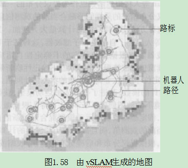 Rao-Blackwellized 粒子濾波器因式分解技術同樣被vSLAM所采用,所以vSLAM也 可以稱為基于視覺的FastSLAM。由 于vSLAM所使用的路標特征為SIFT 特征,而每一個 SIFT 特征又具備區別于其他特征的性能(Distinctive), 無論從地圖創建還是從實際應用的角度來說,vSLAM在數據關聯上的可操作性要優于FastSLAM。正如文獻[74]中提到, 在 vSLAM 中,機器人具有較強的“誘拐恢復”能力。主要原因是由vSLAM生成的地圖中 (如圖1.58所示)存在從視覺圖像中提取的路標。當機器人遭遇誘拐時,會根據路標匹 配從誘拐中恢復過來。