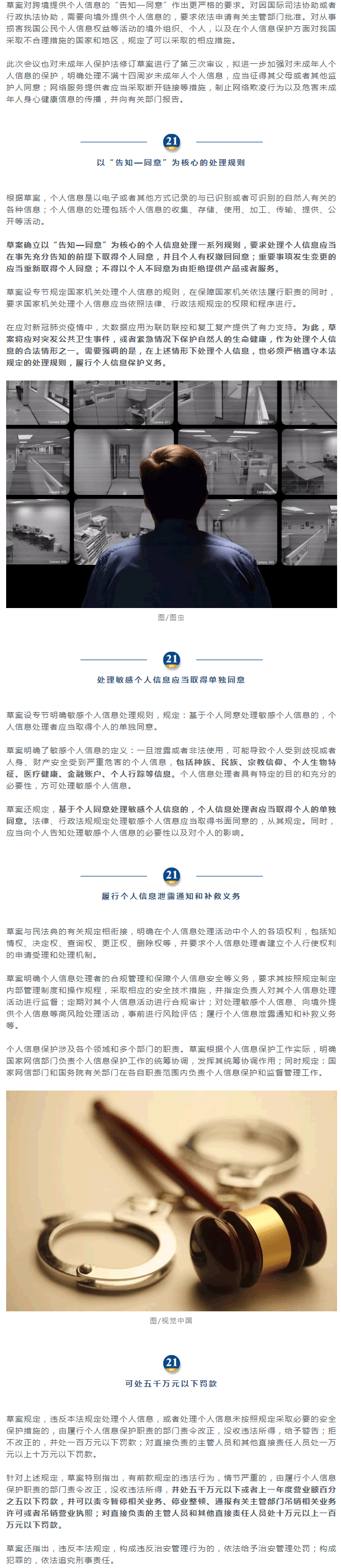 據介紹,草案共八章70條,明確了適用范圍,健全了個人信息處理規則,完善了個人信息跨境提供規則,明確個人信息處理活動中個人的權利和處理者義務,并明確履行個人信息保護職責的部門。