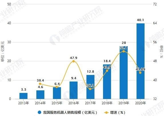 隨著人工智能技術(shù)的發(fā)展,我國服務(wù)機(jī)器人市場也迎來了爆發(fā)式增長,據(jù)前瞻產(chǎn)業(yè)研究院發(fā)布的《中國服務(wù)機(jī)器人行業(yè)發(fā)展前景與投資戰(zhàn)略規(guī)劃分析報告》統(tǒng)計數(shù)據(jù)顯示,2013-2018年整體處于飛速增長階段,2018年中國服務(wù)機(jī)器人市場規(guī)模有望達(dá)到18.4億美元,同比增長約45.3%,G于服務(wù)機(jī)器人市場增速。