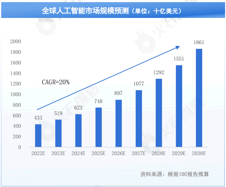 據(jù)IDC估算,2022年Al市場(chǎng)規(guī)模達(dá)到4328億美元,按同比增長(zhǎng)近20%推算,2030年人工智能市場(chǎng)規(guī)模將超過1.8萬億美元。