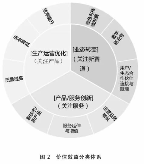 a) 生產運營優化,重點關注傳統產品生產與交付,主要為基于傳統存量業務,聚焦內部價值鏈開展價值創造和傳遞活動,通過傳統產品規模化生產與交易,獲取效率提升、成本降低、質量提G等方面價值效益∶