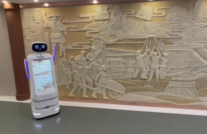 博物館服務機器人亮相博物館,每天為觀眾提供軍事科普講解,信息查詢等服務,能隨機播放館藏戰(zhàn)機重要歷史時刻的音視頻畫面呈現(xiàn)聲音畫面于一體全景式講解